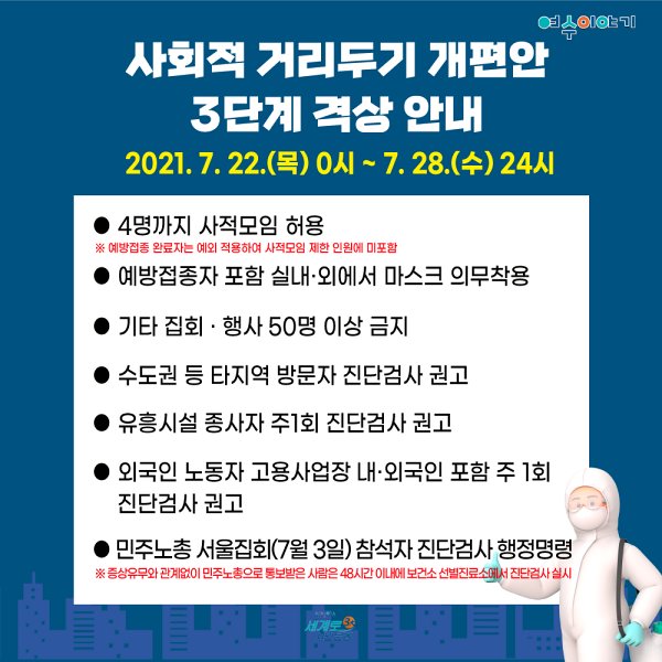 靑 거리두기 3단계, 쉽게 선택할 일 아냐. 코로나19 재확산세가 이어지면서, 사회적 거리두기 3단계 전환이 가시화하는 분위기다. 3단계 격상에 매우, 혹은 대체로 찬성한다는 응답은 69%로, 반대 의견(26%) 보다 높았다. 특산품·이벤트·알짜정보 가득…강원 홍보관 최고 인기. 거리두기 3단계에서는10인 이상의 집합이 금지되며 직장에서도 필수인력을 제외한 인원의 재택근무가 국내 방역 대책에서 사회적 거리두기 3단계는 가장 높은 수준의 대책이다.